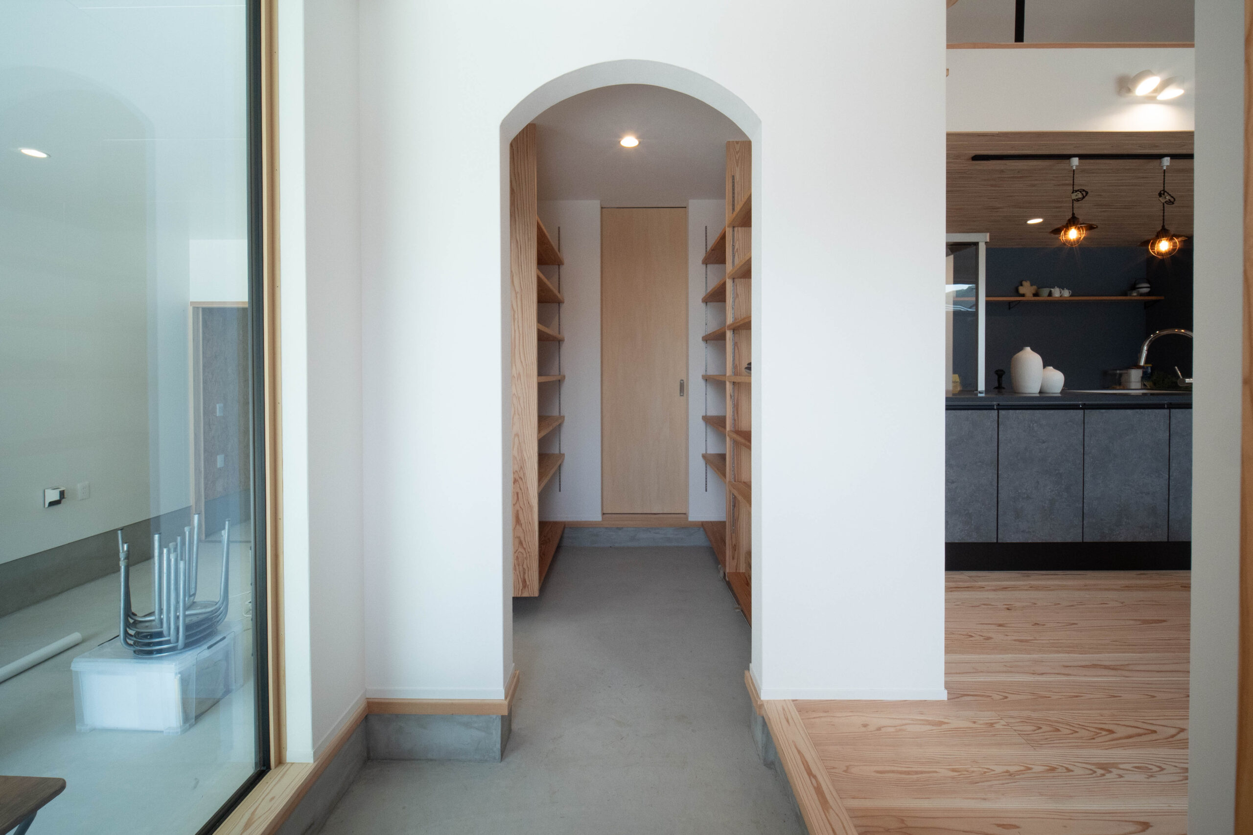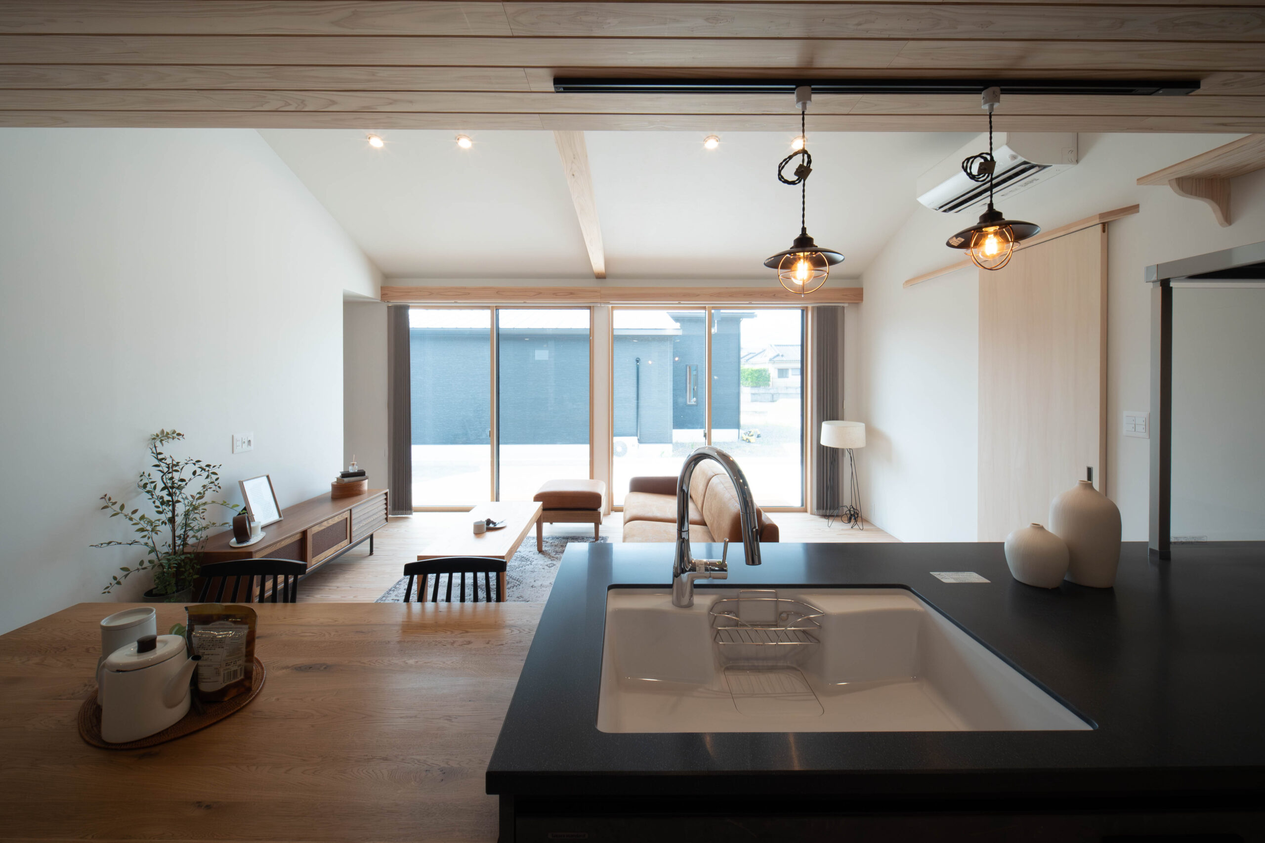 家の中心のキッチンからの風景。 キッチン天井は板張り、窓はカーテンレール上にも照明があり柔らかな光に包まれる。 誰がどこにいるか、が感じられる。