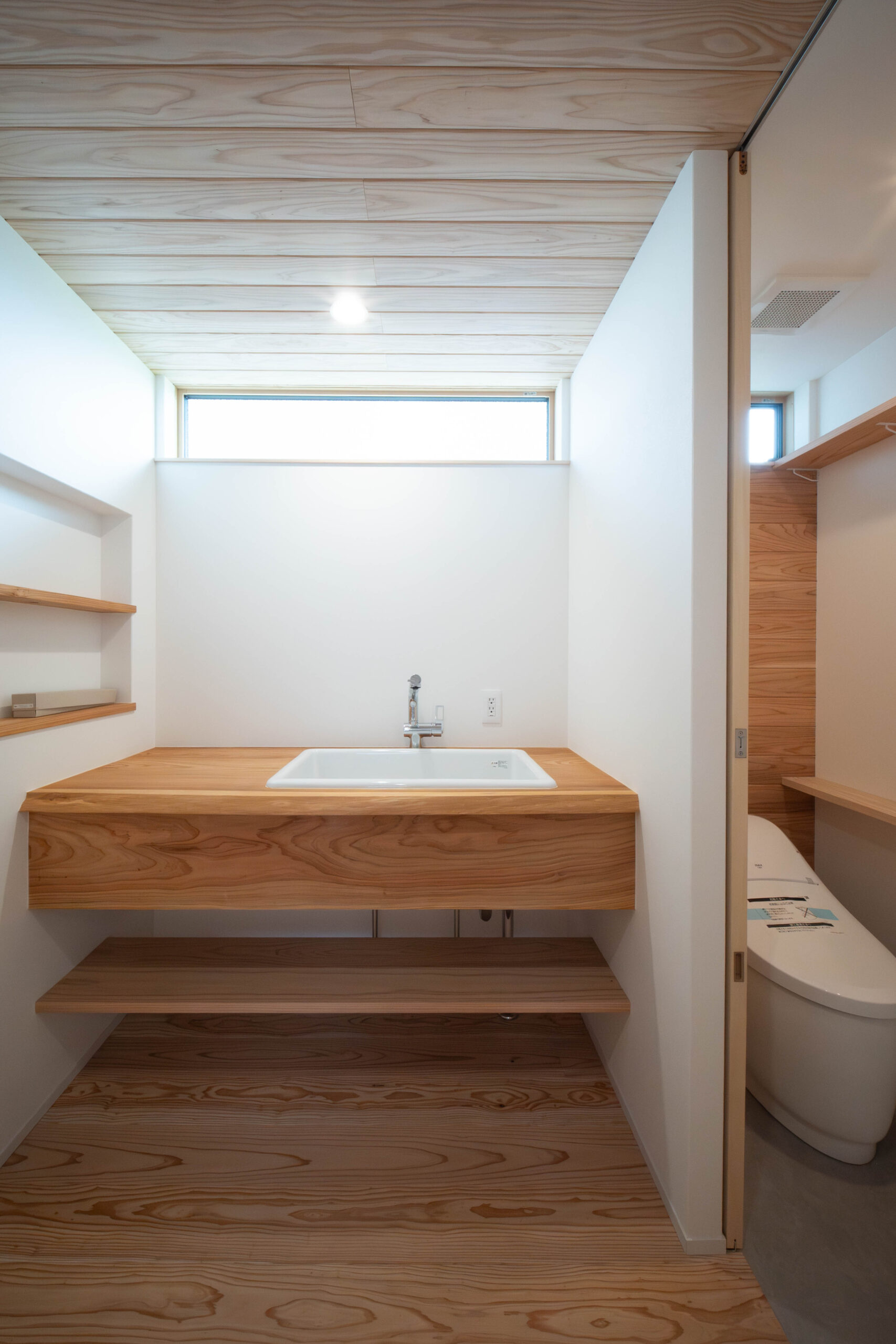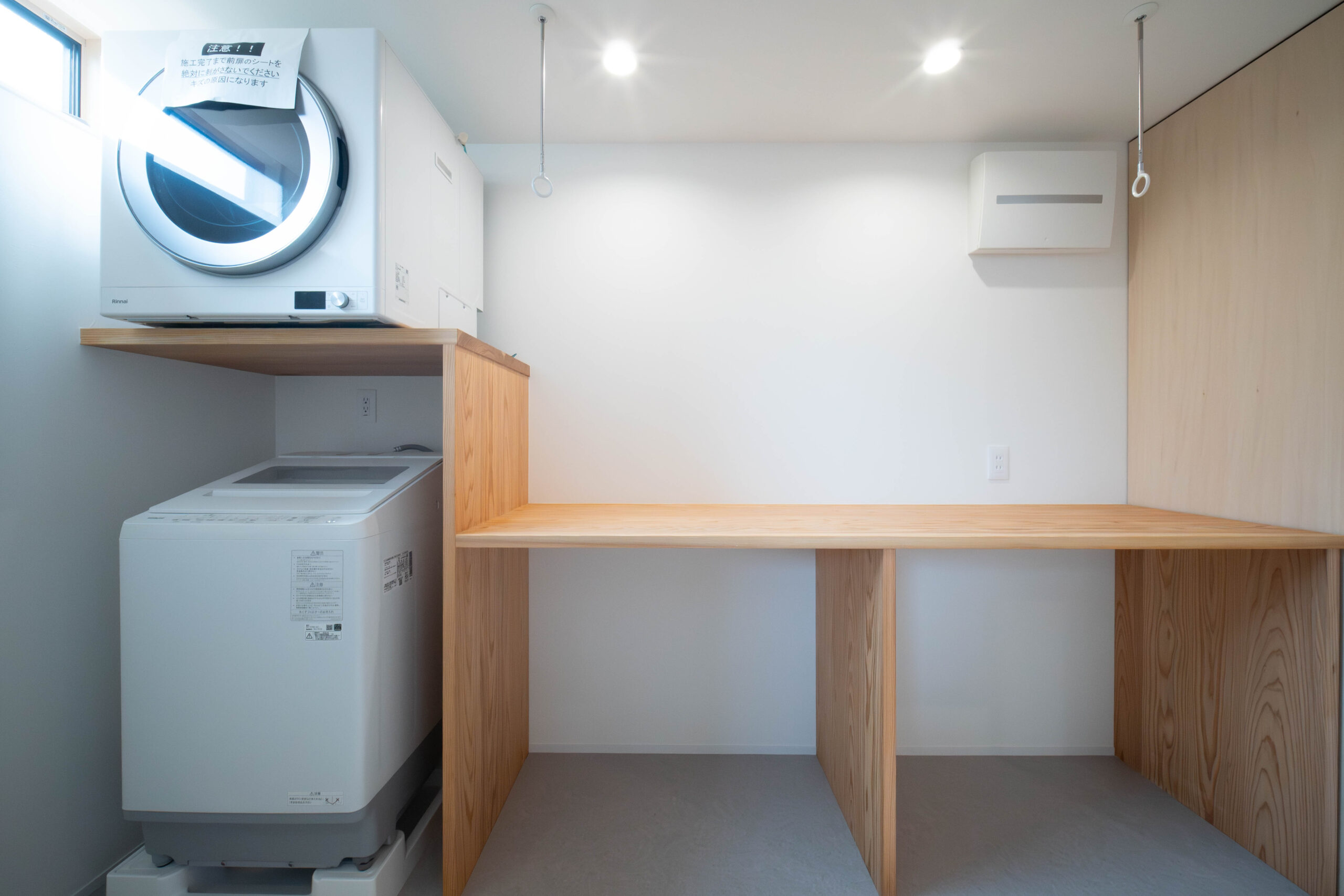脱衣室で洗濯物を「洗う」「感想する」「干す」「畳む」がすべて完結する。 造作棚の下はタオルや下着類を収納する衣装ケースを購入。それに合わせた高さで設計した。