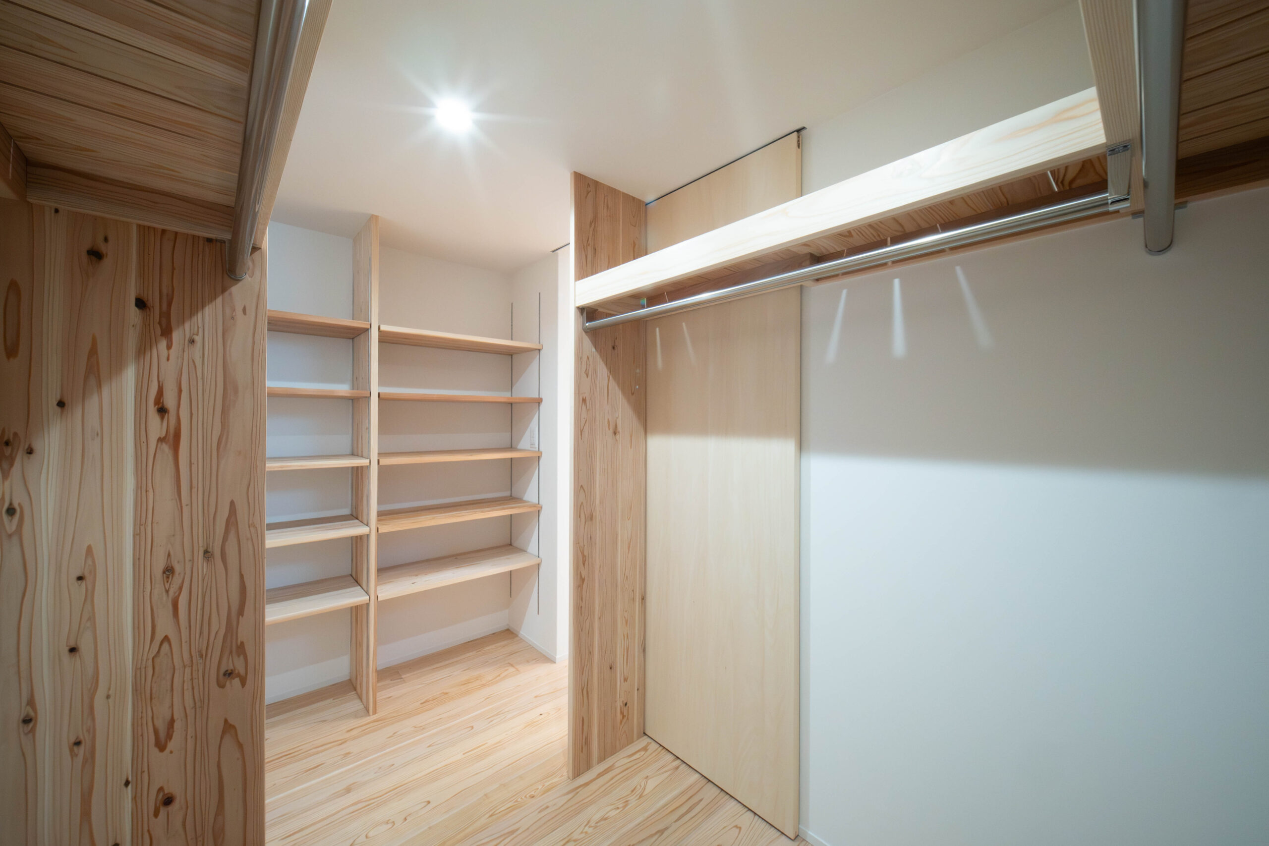 お洋服の多いご家族のWICL。 ハンガーラックのスペースの前面には畳んだ洋服や書類なども気兼ねなく置ける収納棚に。