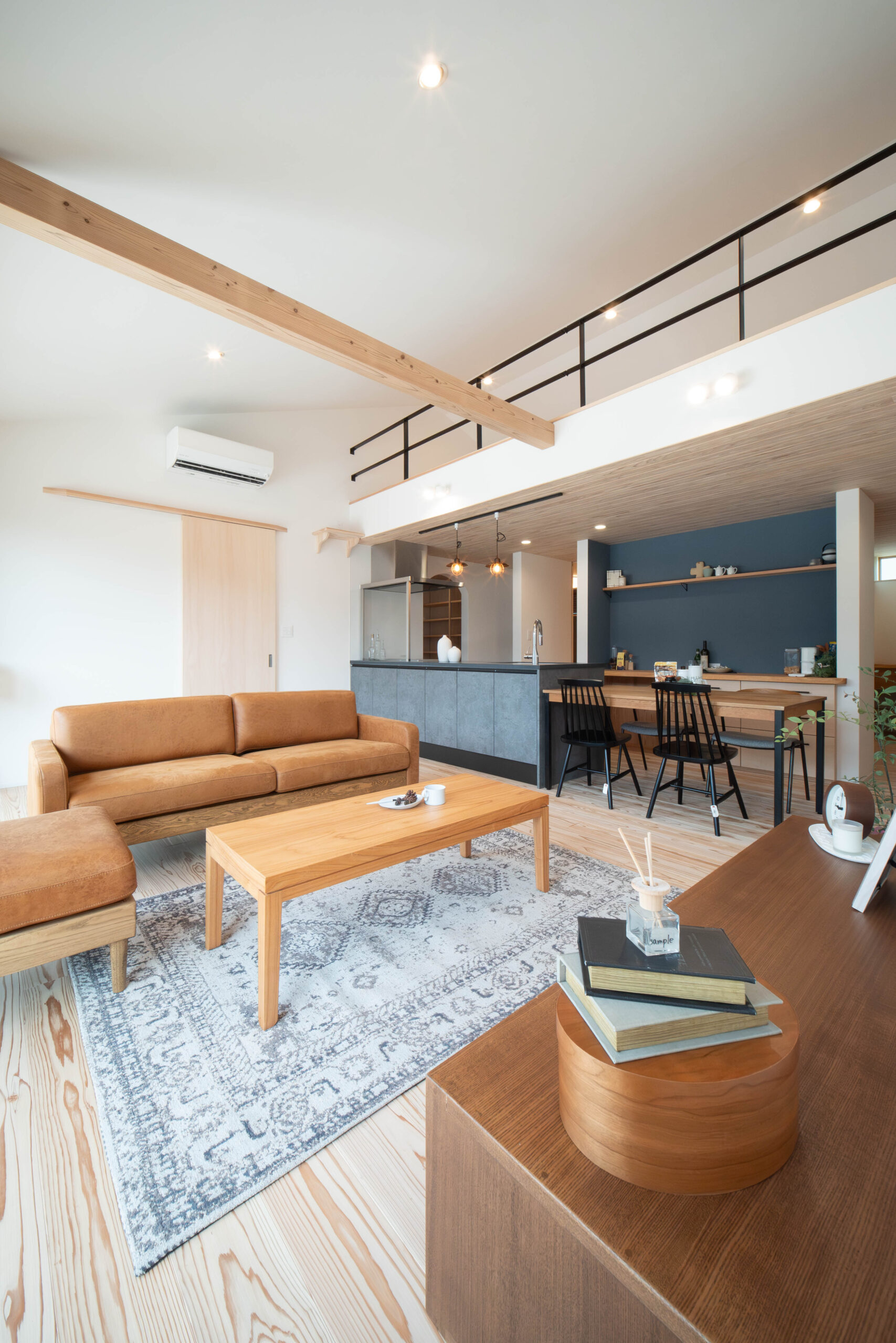 天井勾配と梁が目を引くリビング。 年月を重ねる度にライフステージに合った表情を見せてくれる。
