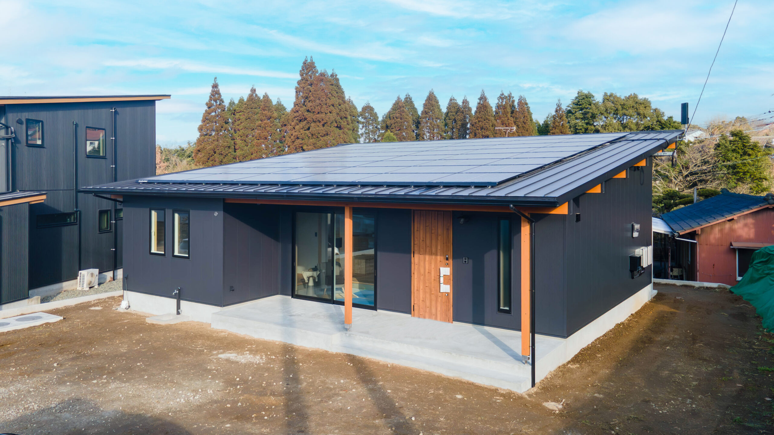 外観はシックに。 大きさは25坪ほどのコンパクトハウスですが お庭も愉しむ余白を残した家の配置