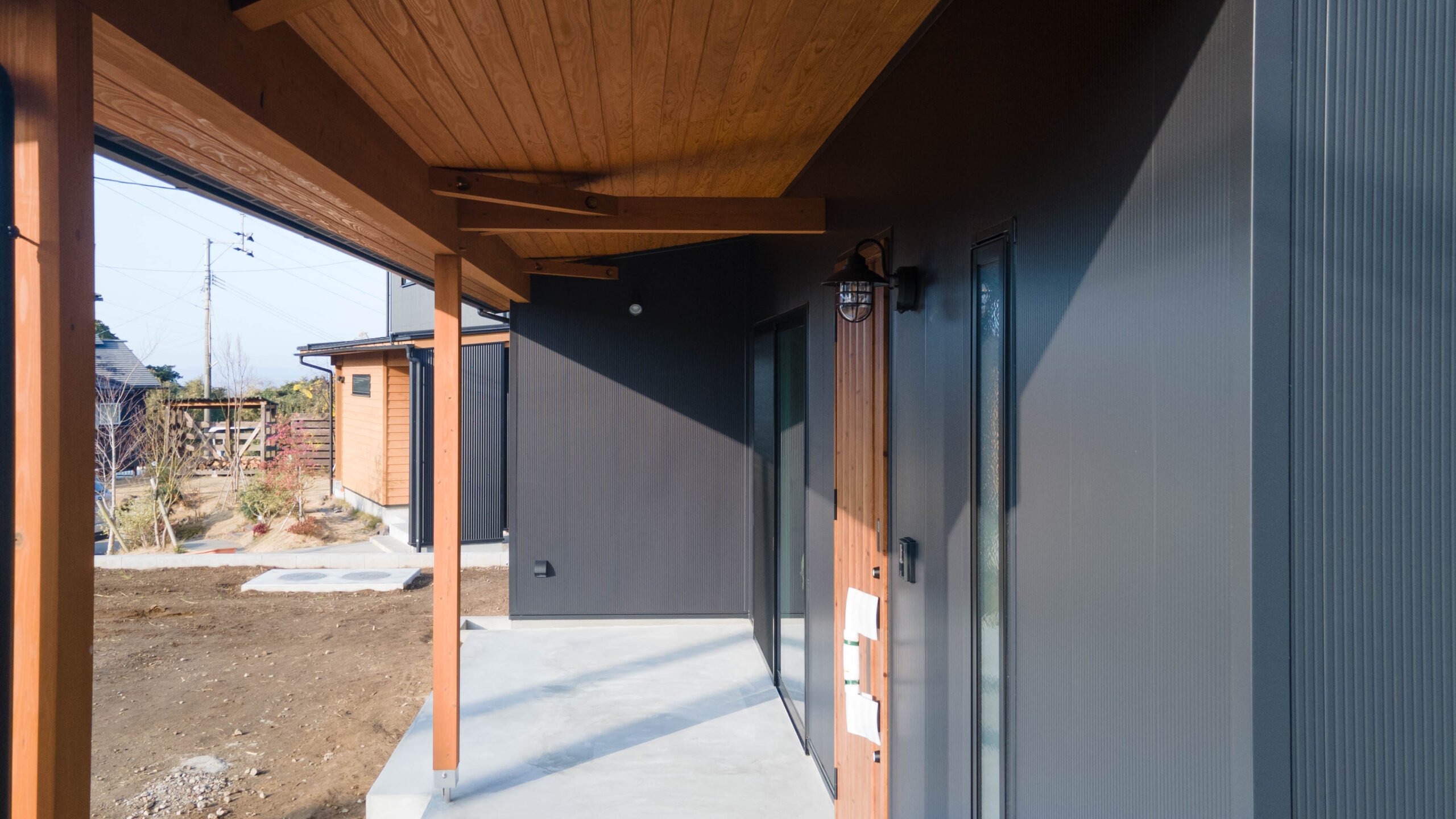 深い軒、土間のデッキで家の中と庭を繋げる空間になっている。
