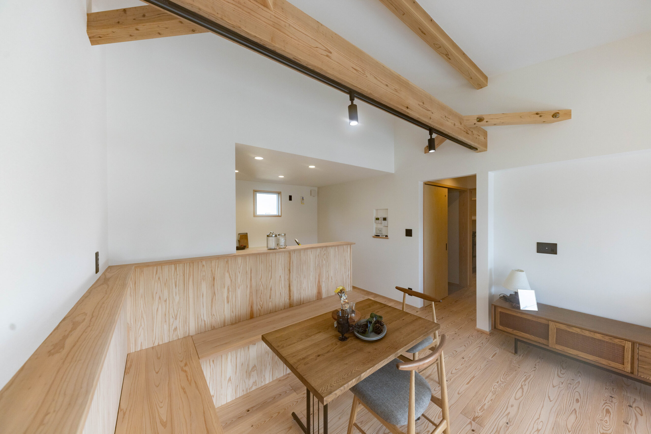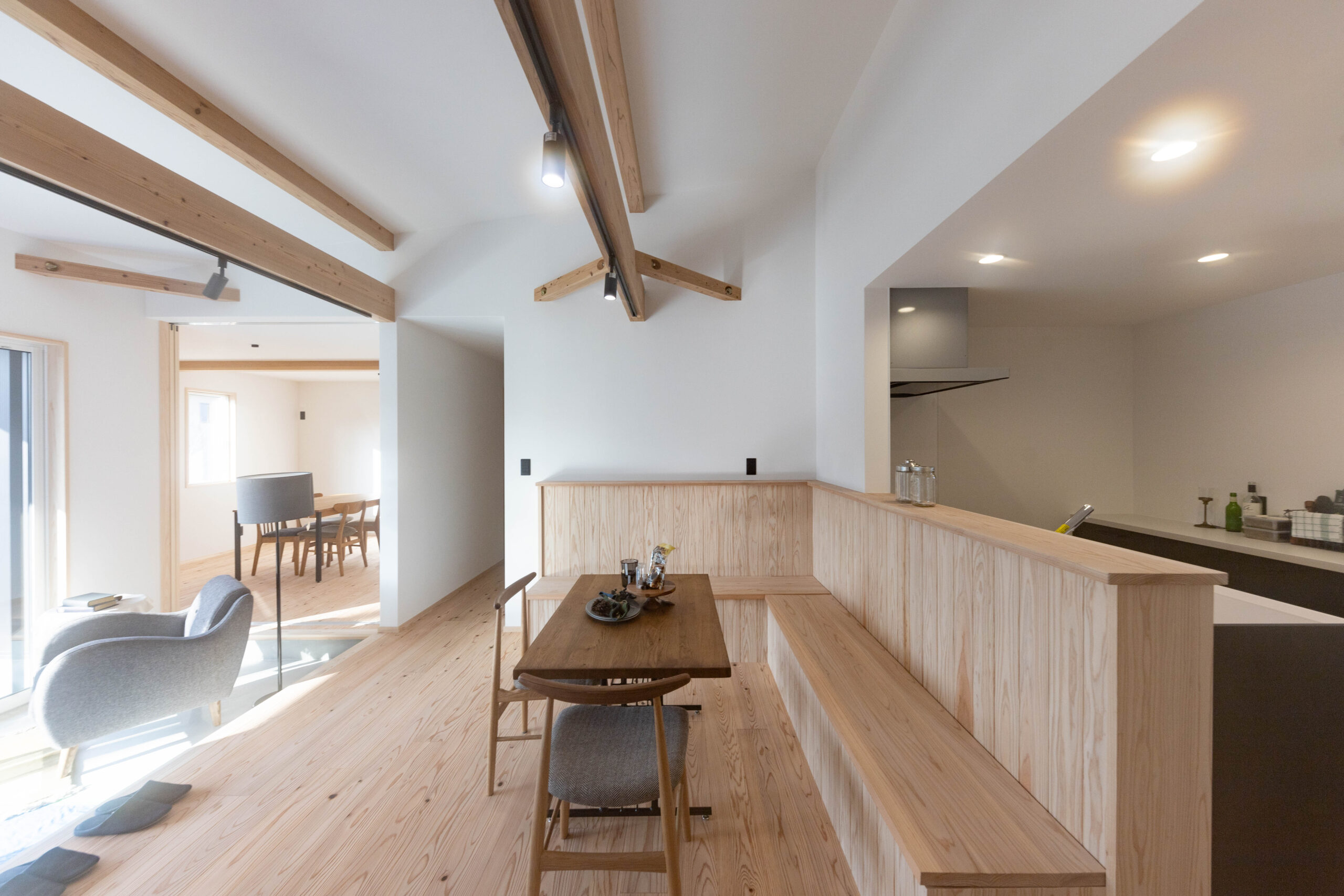 来客の多いご家族のため、 L字型のベンチ、 そして大きな暮らしの真ん中にあるテーブルも造作のもの。 ベンチ下には収納もできる。