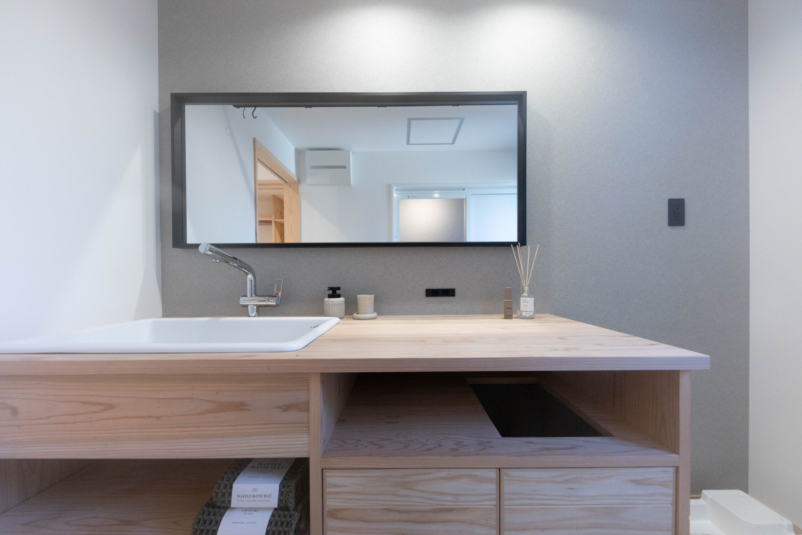 意匠的にも使いやすい造作洗面。 2人並んでも安心の広さと ランドリーボックスを目隠しできることで 気になる洗濯物も来客の目に触れないのがうれしい!