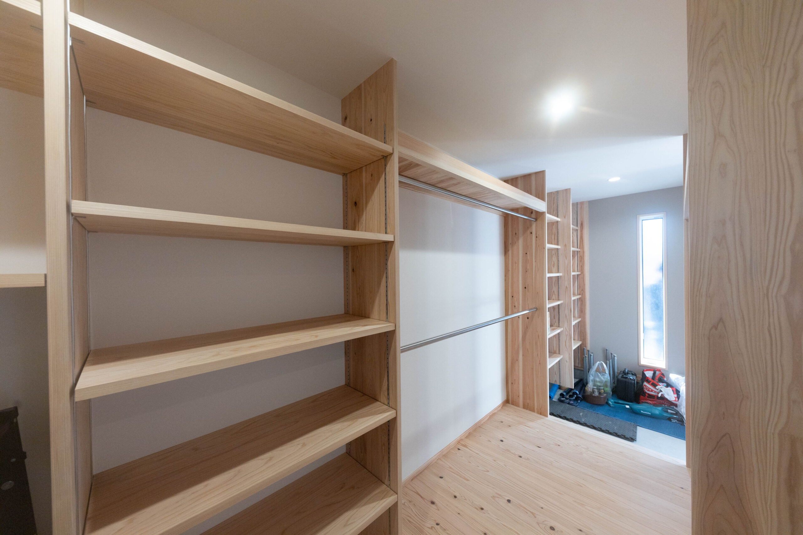 家族の収納はまとめてスペースを確保。 洋服と靴が近い位置にあるため支度がしやすいのが洋服好きにはうれしい。