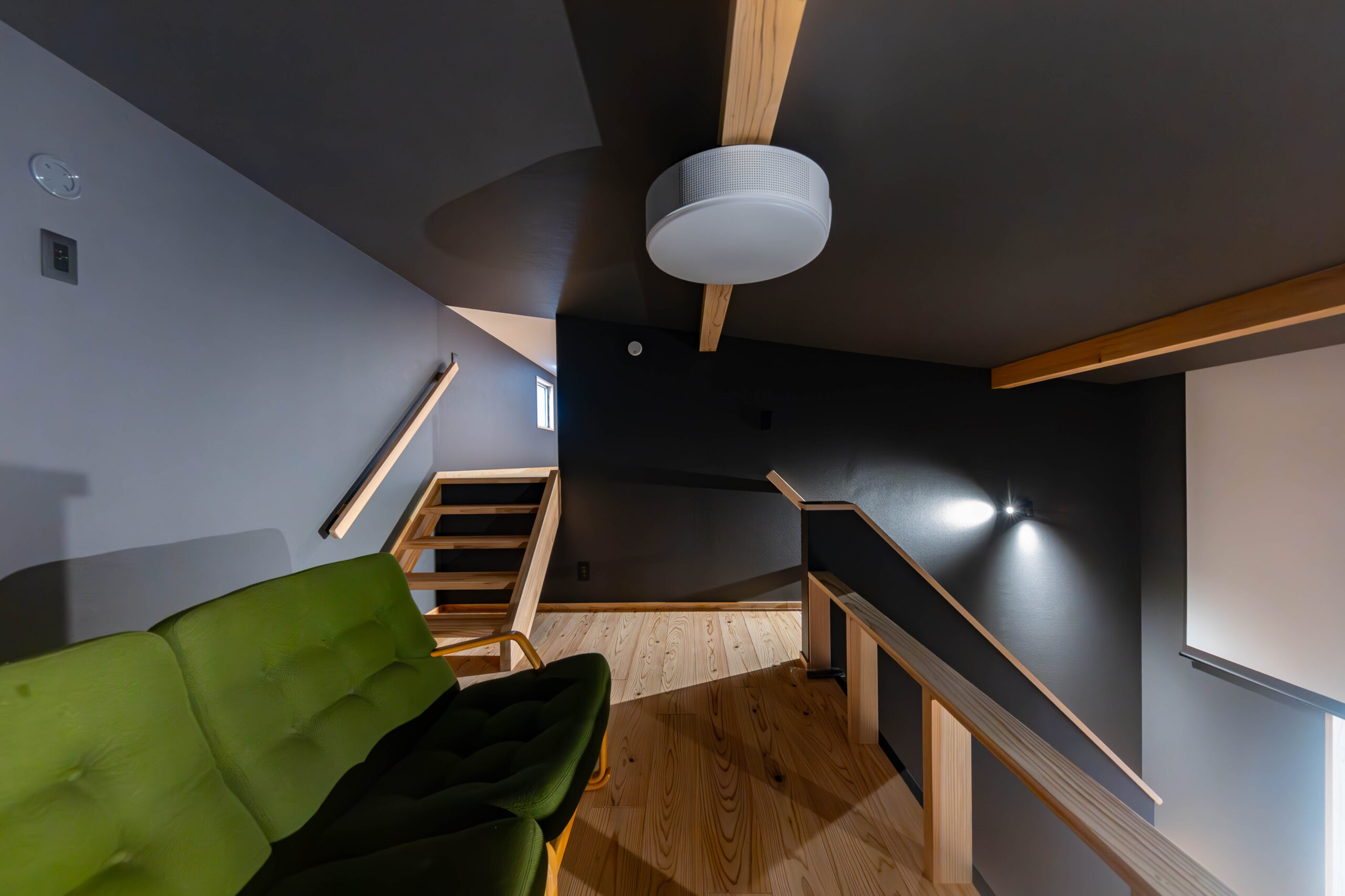 自分の家の中で映画?! 扉を閉めるとゆっくりとスクリーンが下りてくる。 ロフトのような空間からスクリーンを見つめられる設計に。