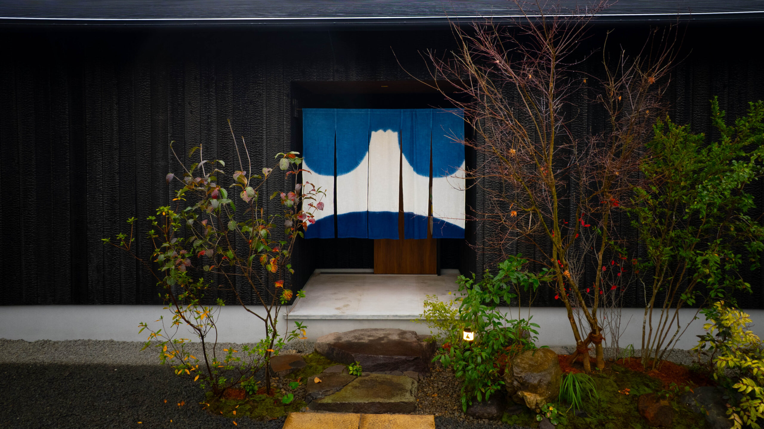 焼杉の外壁に錦江湾と桜島モチーフの暖簾がよくなじみます。 この藍染の暖簾も地元の作家さんへお施主様がオーダーした世界に一つだけのもの!