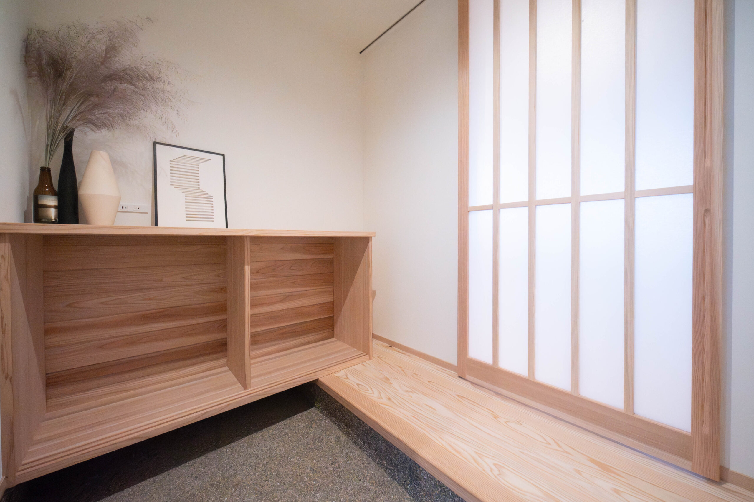 洗いだしの玄関に障子の仕切り。 土地に馴染む空間づくりがお上手。