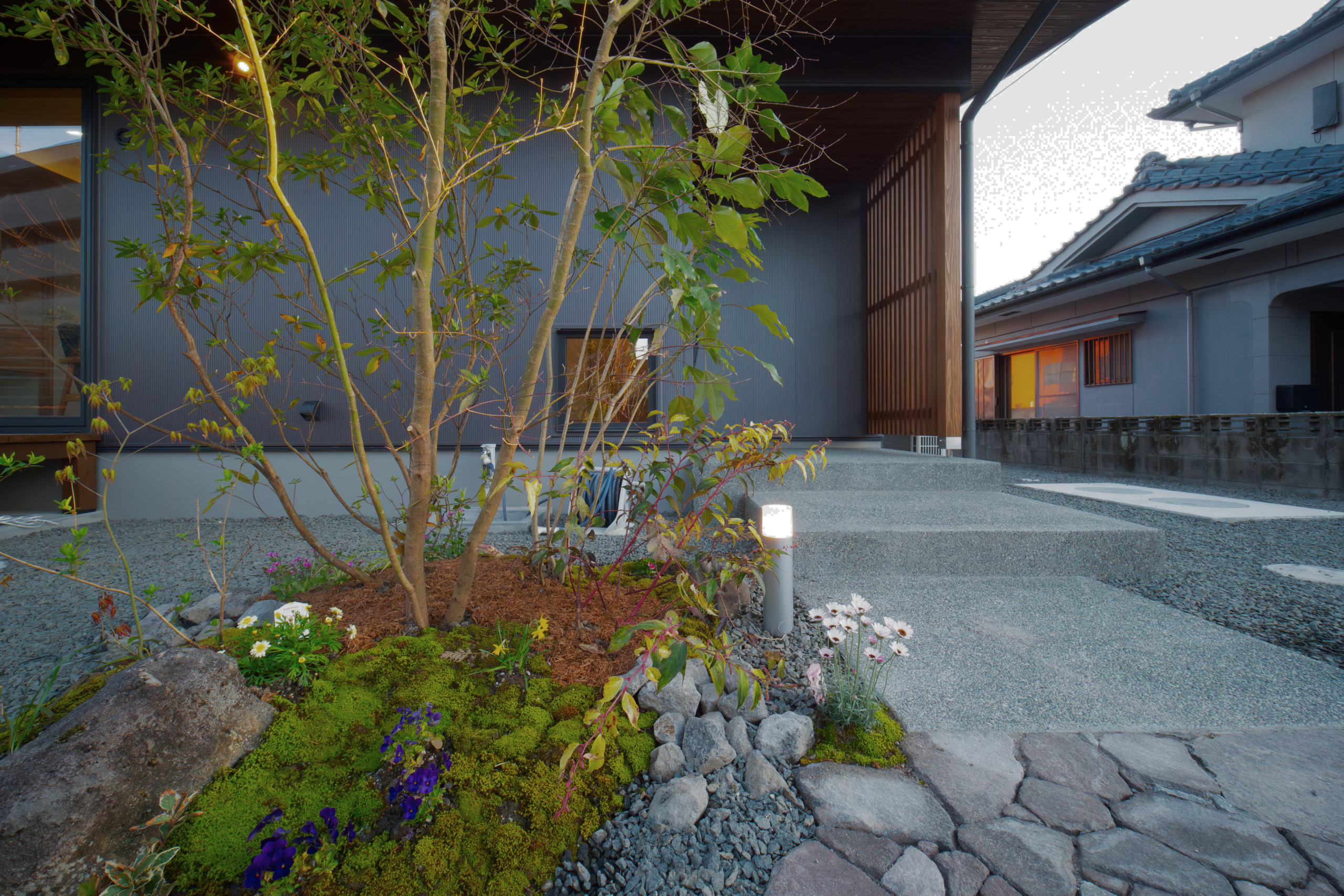 アプローチからは洗い出し。 定期的に水で洗い流すといつまでも風合いが味わえます。