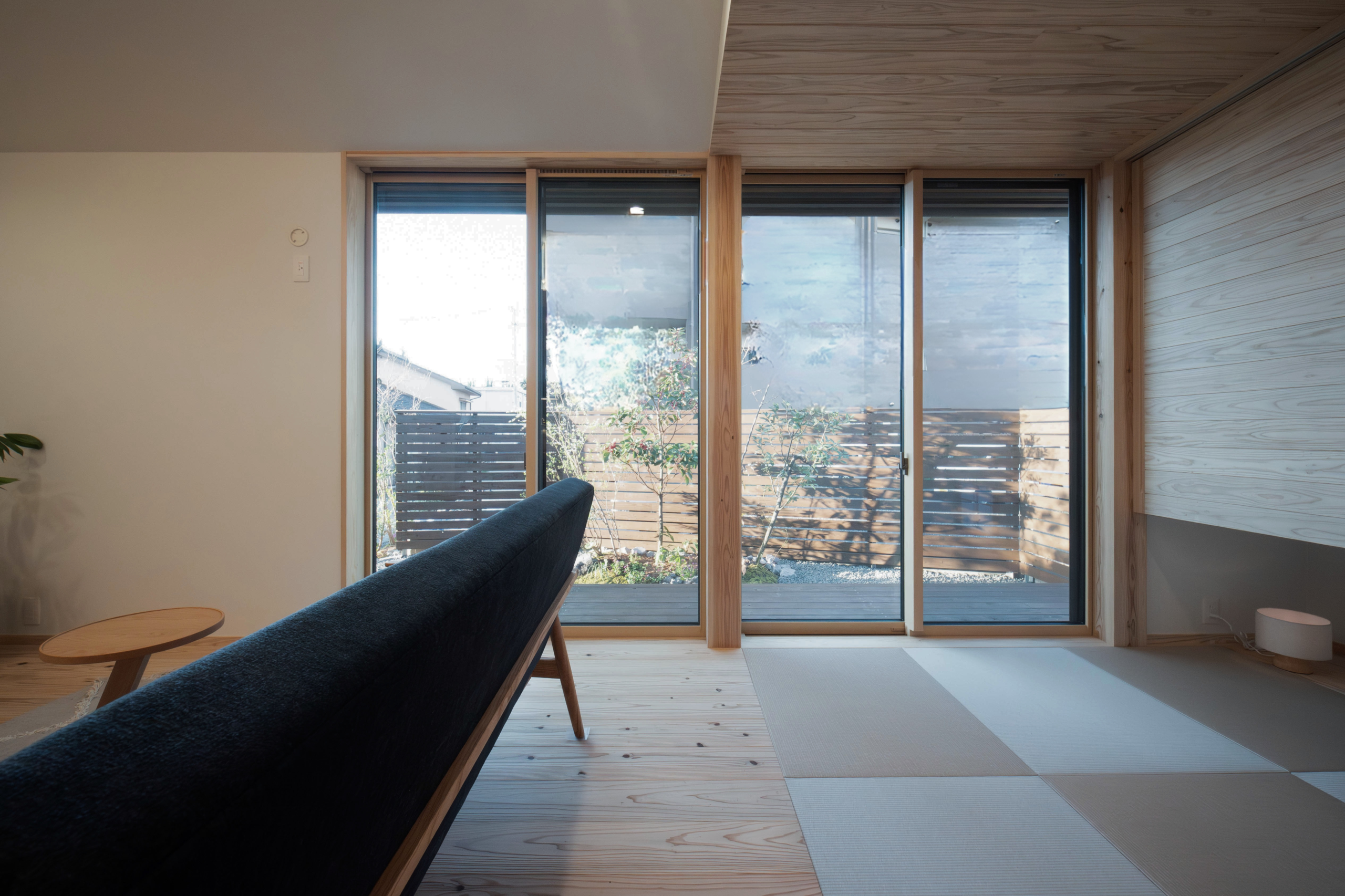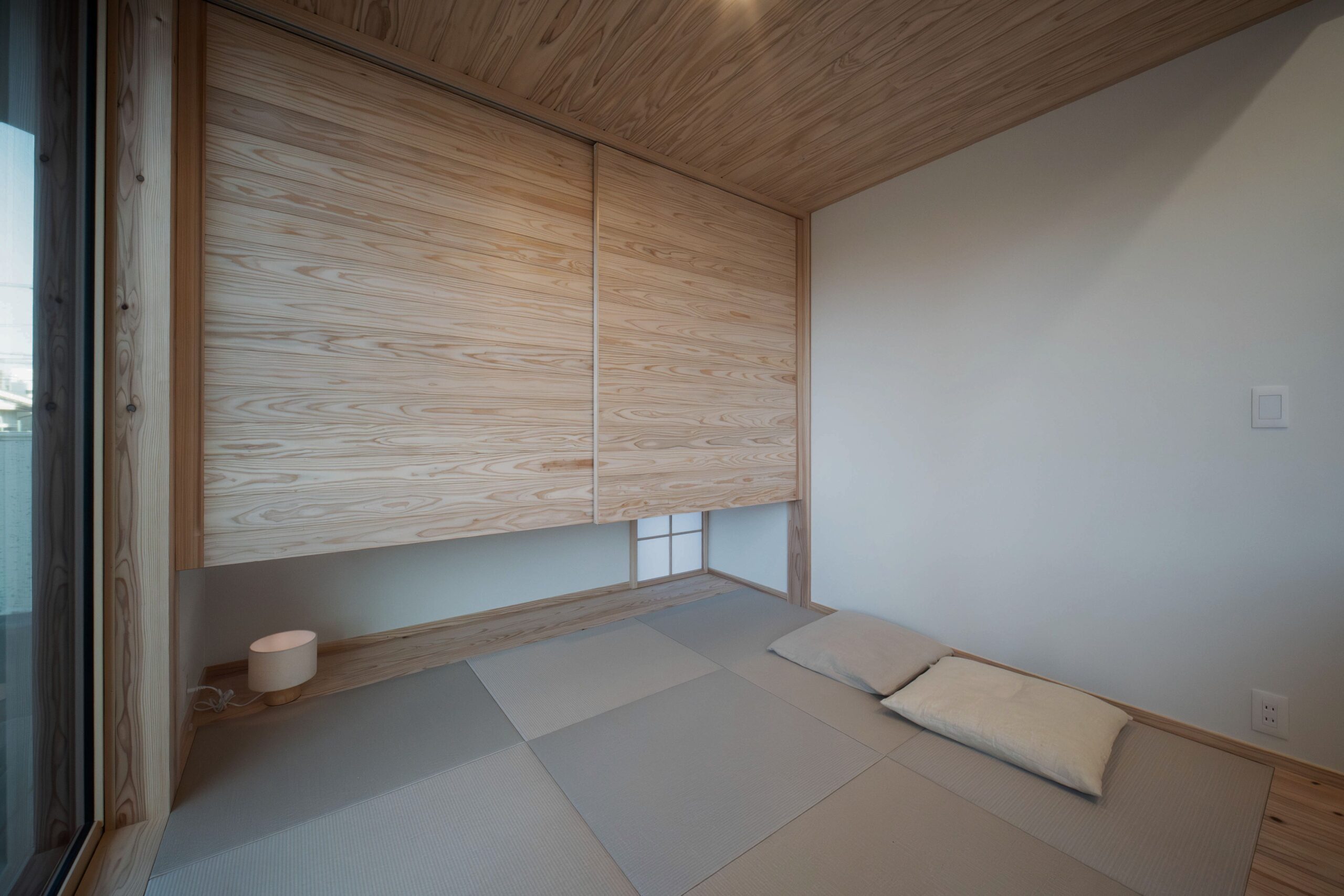 和室は来客が多いため、吊戸棚に来客用お布団を収納。 障子の小窓から西日を柔らかく取り入れる。