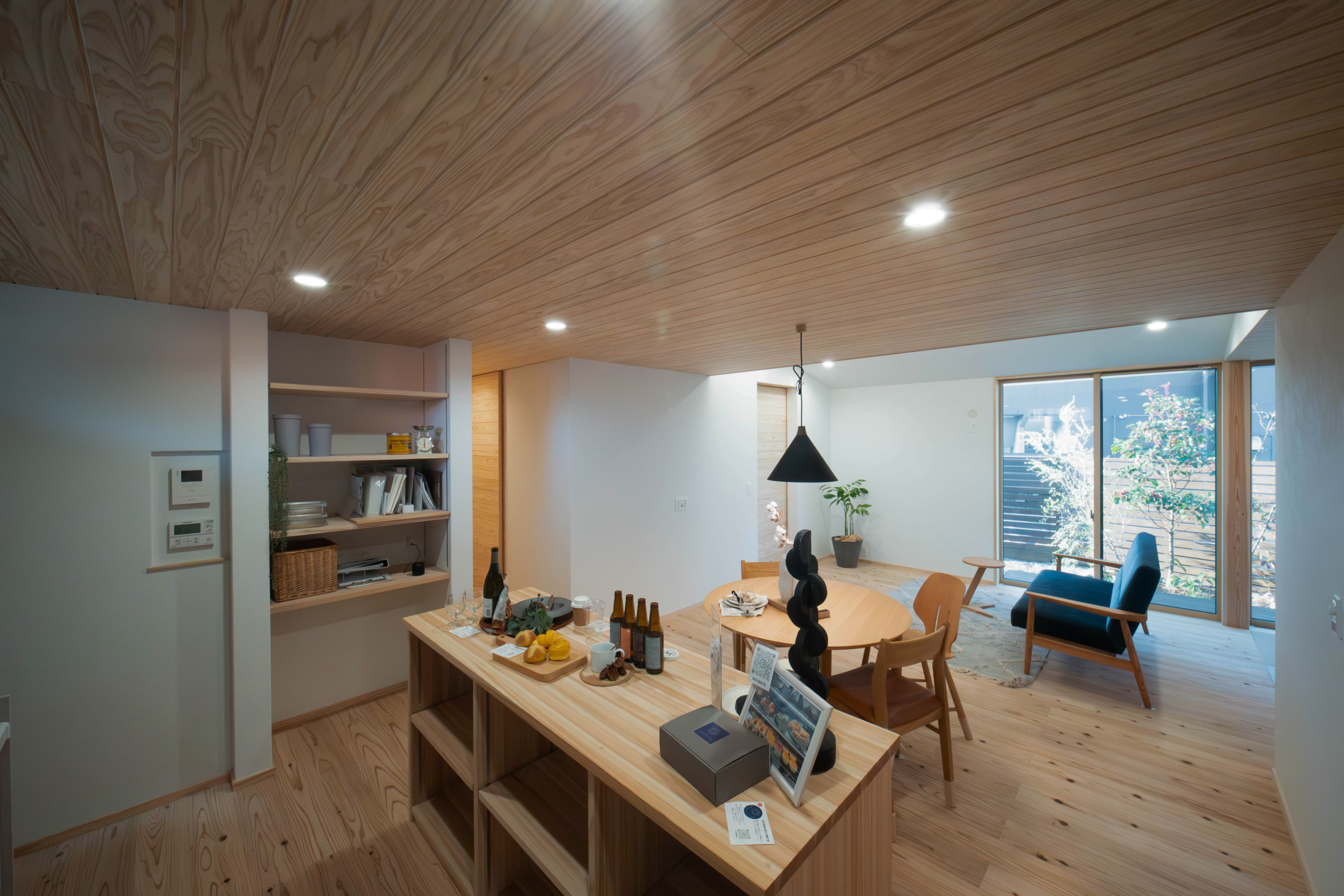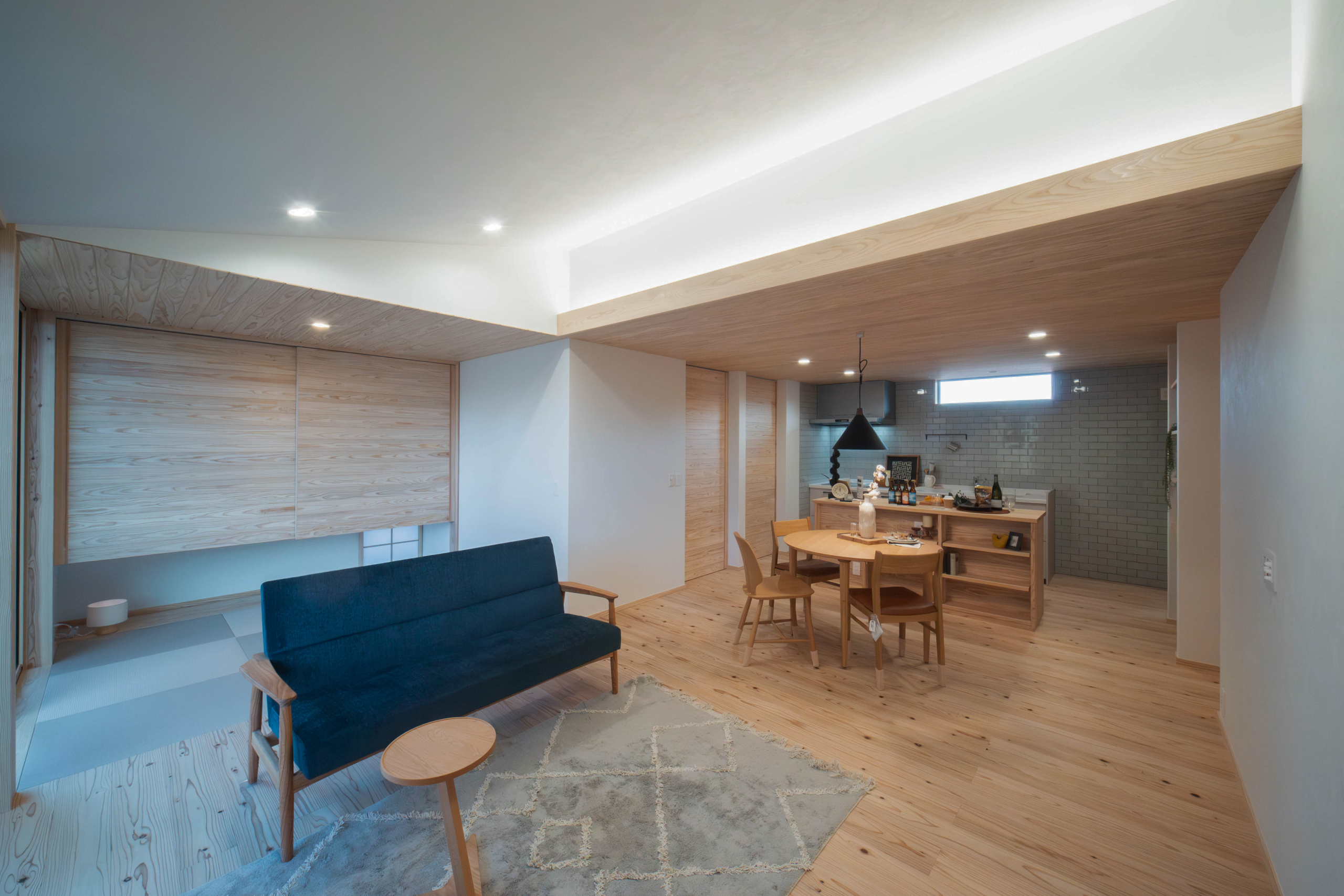 リビングは天井勾配にして間接照明。 少ない照明で明るい設計に。