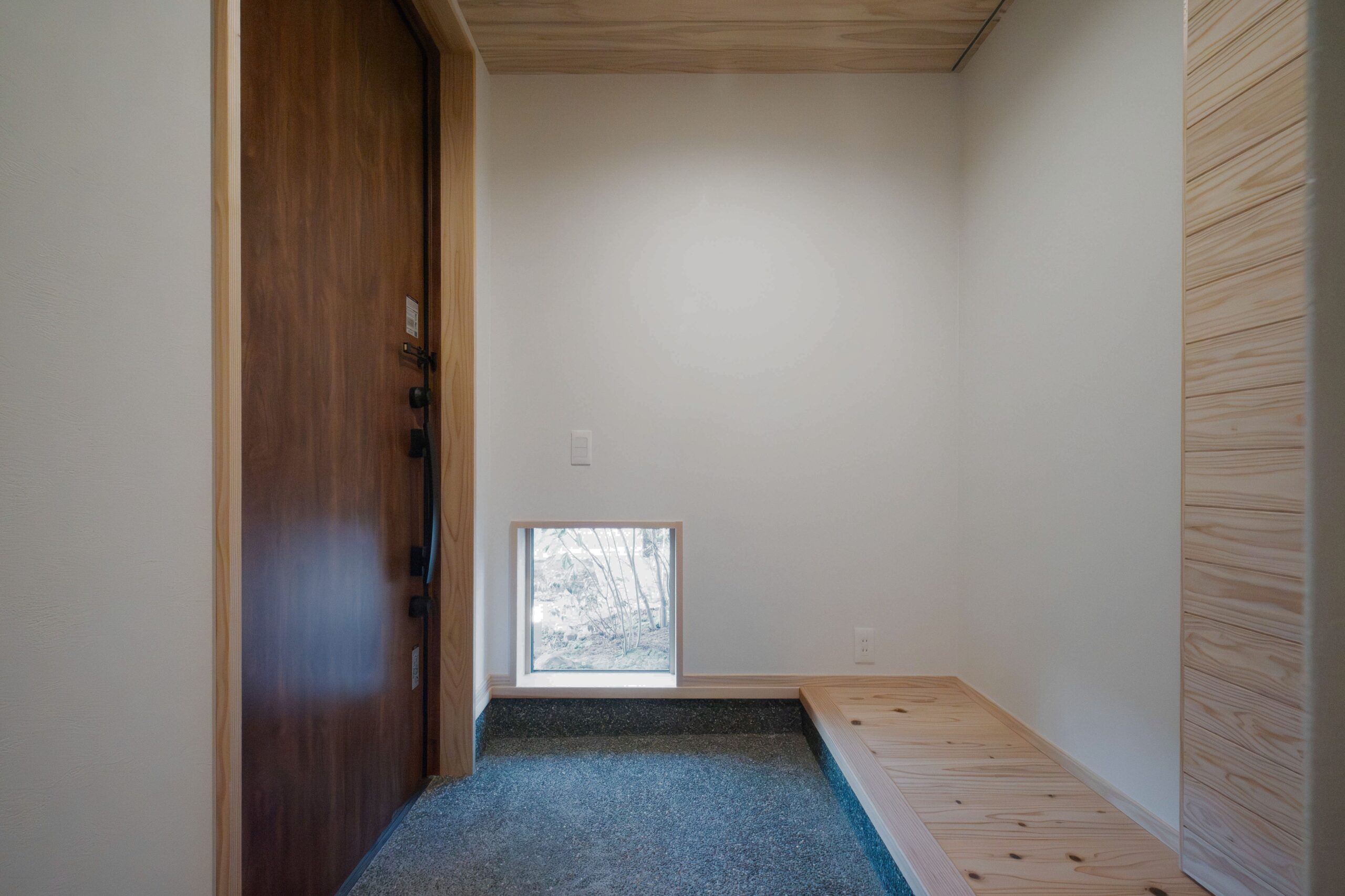 小窓は光取り、そして窓の向こうには植栽が見えてほっこり。
