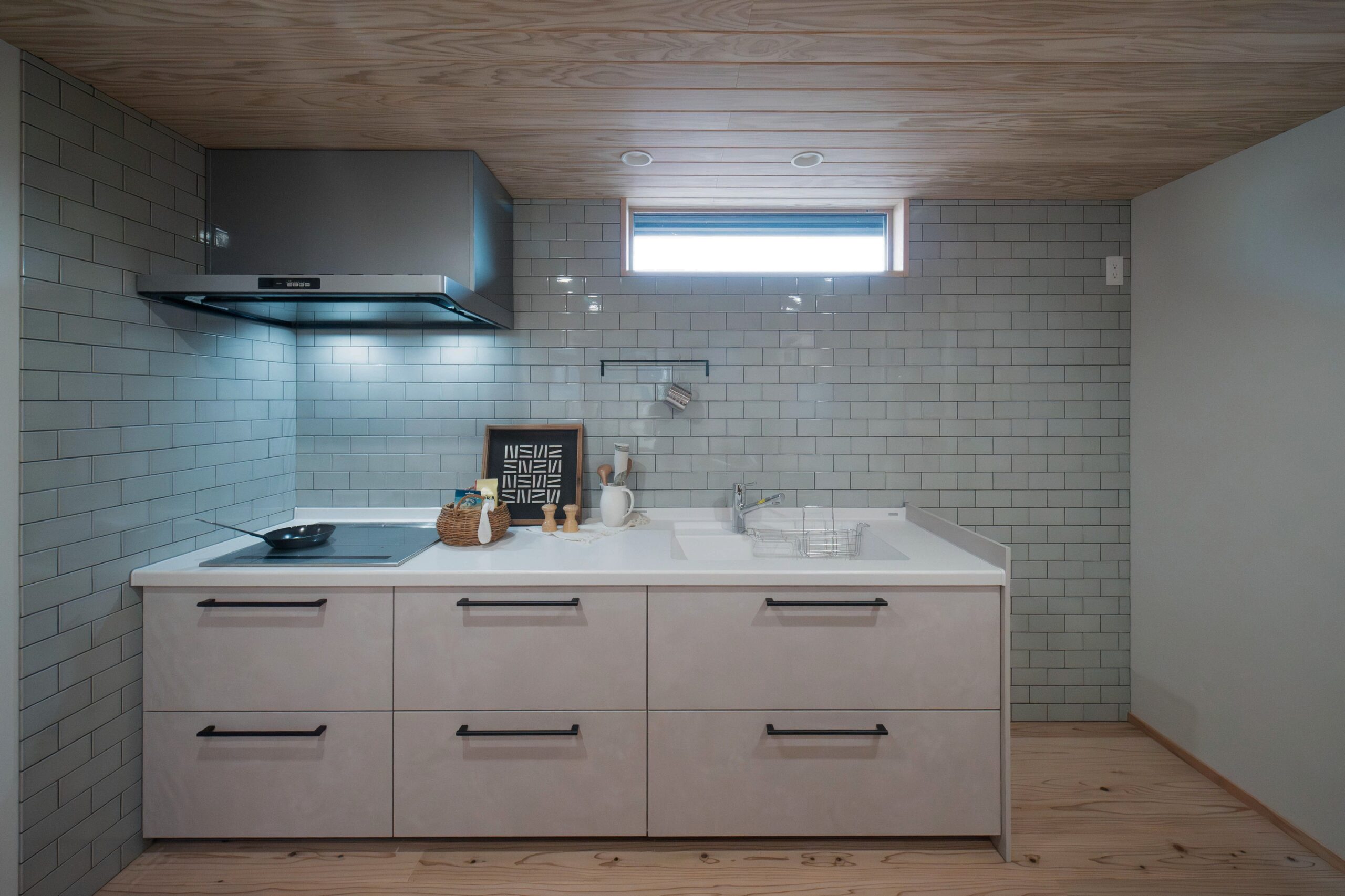 一面タイルの壁付けキッチン! 汚れも掃除しやすく、 アイアンで調理道具を吊るせるのがうれしい!